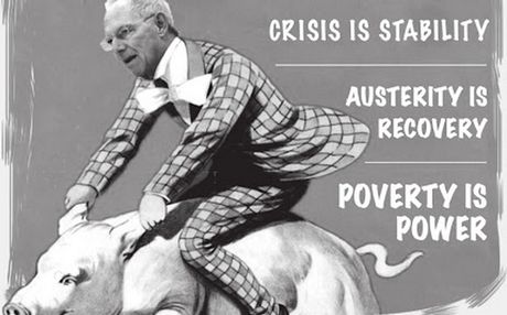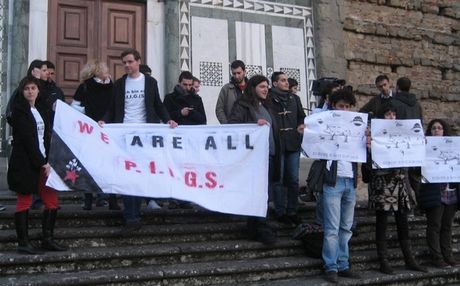 Νωρίτερα οι φοιτητές που ντύθηκαν «γουρουνάκια» σατιρίζοντας το ακρωνύμιο PIGS για τις υπερχρεωμένες χώρες του Νότου, είχαν κυκλοφορήσει φυλλάδιο με ρήσεις του Βόλφγκανγκ Σόιμπλε τον οποίο εικόνιζαν να καβαλάει ένα χοίρο.
