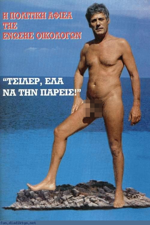 Όπως την περιβόητη αφίσα με εκείνον γυμνό και «ορθωμένο», πάνω σε μια βραχονησίδα, να δηλώνει «Τσιλέρ, έλα να την πάρεις».