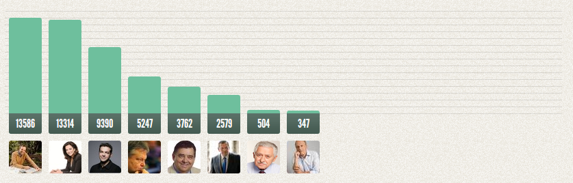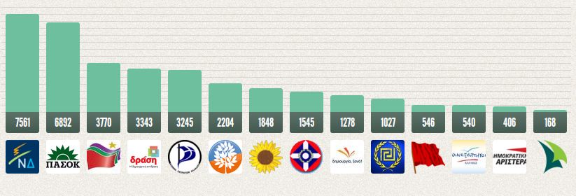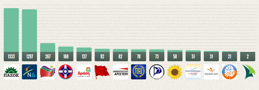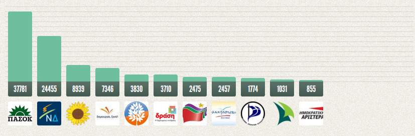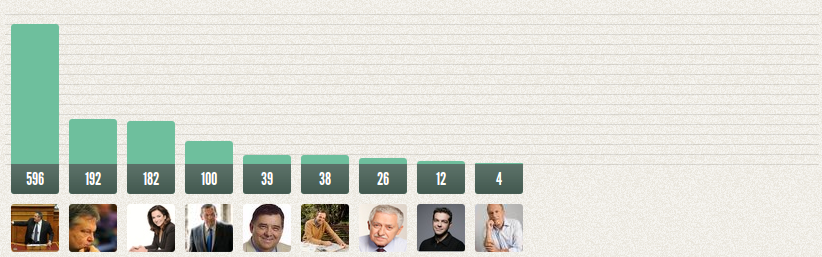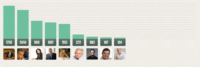 Σύμφωνα με τα στοιχεία που καταγράφει η ιστοσελίδα (μέτρηση ανά 24 ώρες), φαίνεται πως η Νέα Δημοκρατία έχει πολύ καλές επιδόσεις στο Twitter, με 7561 followers και πολλά mentions. Aντίθετα το ΠΑΣΟΚ φαίνεται πως είναι πιο δυνατό στο Facebook καθώς συγκεντρώνει τα likes 37.781 χρηστών με τη ΝΔ να ακολουθεί με 13.000 λιγότερους χρήστες.